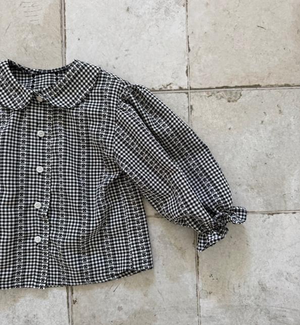 ガーリーテイスト溢れるギンガムチェックブラウス!ギンガムチェックにフェイクの花柄刺繍のストライプが入って洒落感を演出!女の子らしい丸襟や、丸みのあるバルーン袖、フリルデザインの袖口が可愛いです!袖口はゴム仕様で伸縮します。シャツ地なので生地自体の伸縮性はありません。