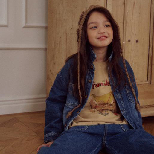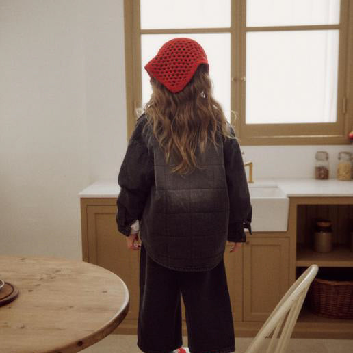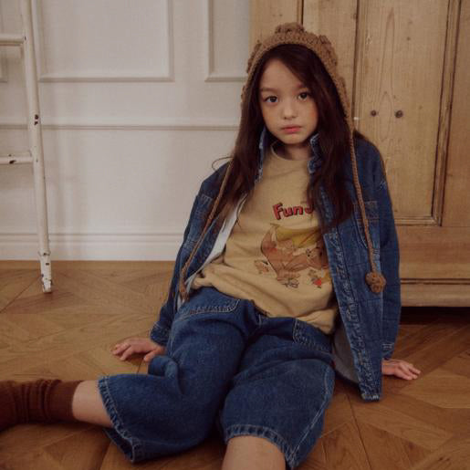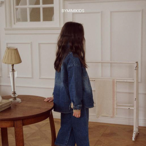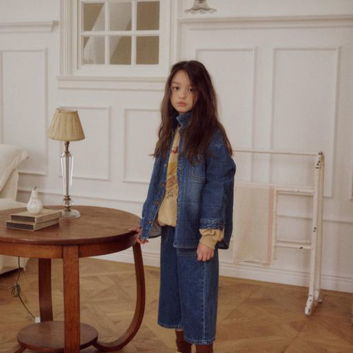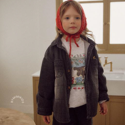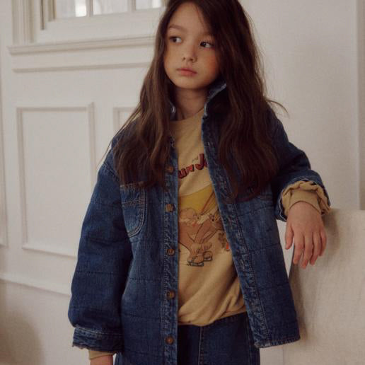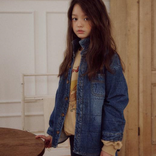 デニムキルティング地がお洒落なオータムジャケット!柔らかなキルティング素材で着心地GOOD!秋はTOPS、冬はINNERとして活躍できる一枚です!色褪せ加工の古着テイストで洒落感のあるアイテムです!男の子でも女の子でも着用頂けます!