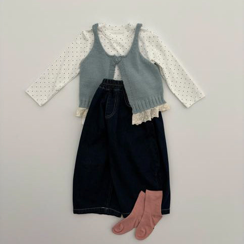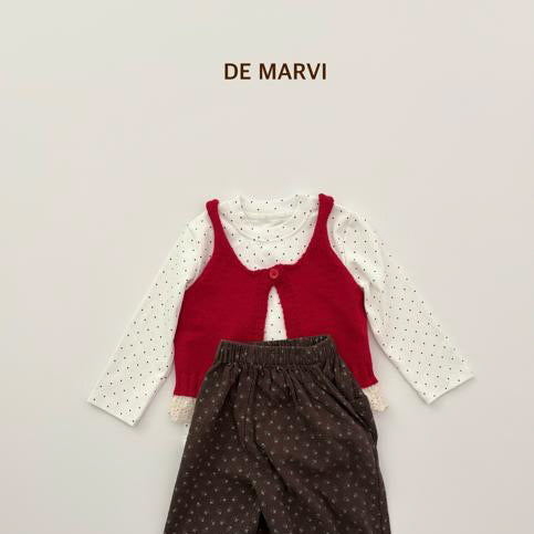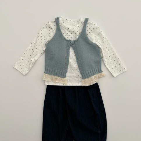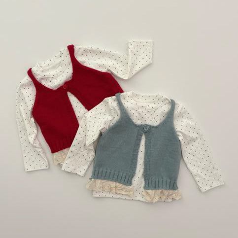 レイヤードスタイルの可愛いニットビスチェカットソー!ニットビスチェとカットソーは分けて着用することができます!カットソーもガーリーなドット柄でGOOD!実店舗で人気のあるアイテムです!生地に伸縮性があります。